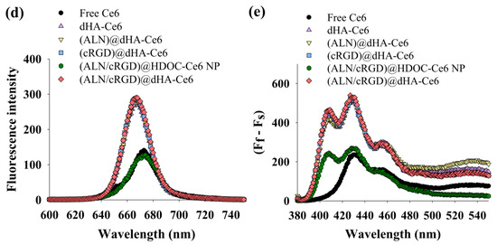 Figure 2d shows the fluorescence Ce6 intensity of each dHA sample and (ALN/cRGD)@HDOC-Ce6 NP. Interestingly, free Ce6 or (ALN/cRGD)@HDOC-Ce6 NP exhibited reduced NIR fluorescence intensities at 670 nm, probably owing to the auto-quenching event of Ce6 molecules originated from their Ce6 aggregates formation in aqueous solution [42,45]. However, water-soluble dHA-Ce6, (ALN)@dHA-Ce6, (cRGD)@dHA-Ce6, and (ALN/cRGD)@dHA-Ce6 exhibited increased fluorescence intensity owing to the free mobility of fluorescent Ce6 molecules attached to water-soluble dHA.