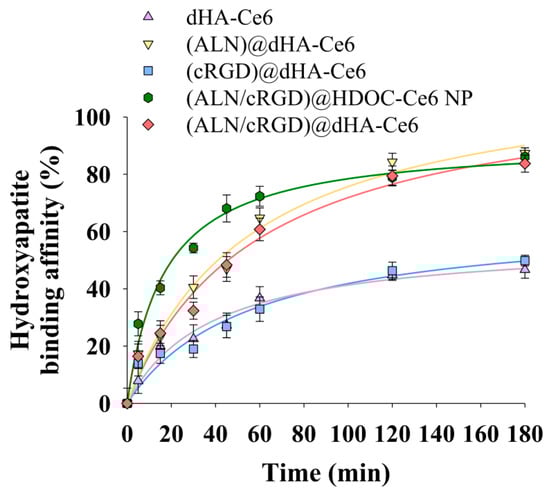Figure 3 shows the hydroxyapatite binding affinity of each dHA sample and (ALN/cRGD)@HDOC-Ce6 NP. First, dHA-Ce6 and (cRGD)@dHA-Ce6 without ALN showed a relatively low 35–40 wt.% nonspecific binding affinity after 180 min, while (ALN)@dHA-Ce6, (ALN/cRGD)@HDOC-Ce6 NP, and (ALN/cRGD)@dHA-Ce6 showed increased binding affinity equivalent to approximately 80 wt.%, probably owing to Ca2+ (bone)-mediated electrostatic interaction with ALN [25,26,27]. These results indicate that dHA samples with ALN have enhanced bone-targeting ability.