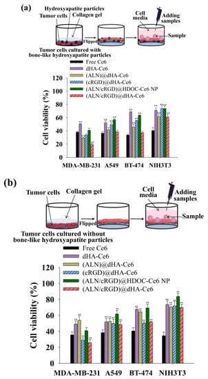 Phototoxicities were determined by a CCK-8 assay of MDA-MB-231, A549, BT-474, and NIH3T3 cells cultured in collagen gel-containing cell medium (a) with or (b) without hydroxyapatite particles. All cells were treated with free Ce6 (10 μg/mL) or each sample (equivalent Ce6 10 μg/mL) for 4 h and illuminated for 10 min at a light intensity of 5.2 mW/cm2 using a 670 nm laser source (n = 7, as multiple experiments, ** p < 0.01 compared to free Ce6). A detailed description of each sample was given in the Figure 3 legend.