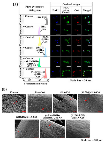 (a) Flow cytometry analysis and confocal images of MDA-MB-231 cells treated with free Ce6 (10 μg/mL) or each sample (equivalent Ce6 10 μg/mL) at 37 °C for 4 h. (b) SEM images of MDA-MB-231 cells (cultured on tibia of ex vivo bone metastasized model) treated free Ce6 (10 μg/mL) or each sample (equivalent Ce6 10 μg/mL). Red arrows indicate tumor cells. A detailed description of each sample was given in the Figure 3 legend.