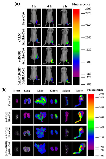 The in vivo tumor-targeting ability of each dHA sample was also investigated using a tumor-bearing mouse model with MDA-MB-231 tumors implanted on the right tibia. The dHA sample (equivalent Ce6 2.5 mg/kg) or free Ce6 (2.5 mg/kg) was intravenously injected to the tail vein of mice, and their fluorescence images were obtained for 24 h using a FOBI (Figure 6a,b) [4,49]. As shown in Figure 6a, (ALN/cRGD)@dHA-Ce6 exhibited a strong Ce6 fluorescence signal at the tumor sites after 8 h post-injection. However, (ALN)@dHA-Ce6, (cRGD)@dHA-Ce6, and free Ce6 exhibited relatively weak Ce6 fluorescence because of the relatively weak tumor-binding ability. Furthermore, we verified the Ce6 fluorescence intensity in excised organs (heart, lung, liver, kidney, spleen, and tumor) at 24 h post-injection (Figure 6b) [4,49]. As a result, (ALN/cRGD)@dHA-Ce6 and (ALN)@dHA-Ce6 exhibited strong Ce6 fluorescence in the tumor site on the right tibia. In contrast, (cRGD)@dHA-Ce6 without ALN and free Ce6 exhibited relatively weak Ce6 fluorescence in the tumor site. It was observed that the fluorescence intensity of (ALN/cRGD)@dHA-Ce6 in normal organs (heart, lung, liver, kidney, and spleen) was relatively weak, indicating reduced accumulation to normal organs.
