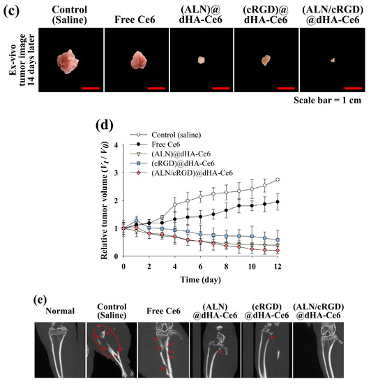 Overall, the results of in vitro/in vivo studies demonstrate that (ALN/cRGD)@dHA-Ce6-mediated photodynamic antitumor therapy can provide an efficient strategy to treat metastatic bone tumors. Furthermore, we confirmed that the targeting efficiency of ALN moieties to bone-metastasized tumors was quite high. Nevertheless, since the in vivo antitumor activity of (cRGD)@dHA-Ce6 with cRGD moieties is not bad, we think that (ALN/cRGD)@dHA-Ce6 with multiple tumor-targeting ability will have various advantages for targeting complicated in vivo tumors. Of course, more clear proof should be clarified through various in vivo antitumor experiments in the future.