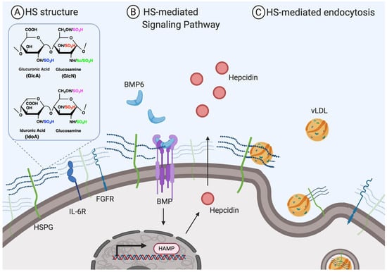 Endogenous heparan sulfate (HS) on the cell surface in a healthy state. (A) Membrane-bound HS is usually attached to core protein in the form of HS proteoglycan (HSPG), such as syndecans or glypican. HS is comprised of repeating disaccharides of glucuronic acid (GlcA)-glucosamine (GlcN) and iduronic acid (IdoA)-GlcN in various sulfation pattern as indicated. (B) Membrane-bound HS acts as a co-receptor for various ligands, for example, BMP6. In hepatocytes, HS mediates hepcidin expression by modulating BMP6/BMP binding. (C) Membrane-bound HS acts as a receptor to facilitate lipid clearance, for example, vLDL in the liver.
