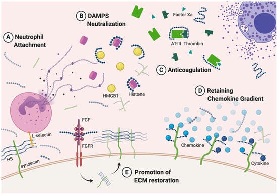 Endogenous HS on the cell surface in a disease state. (A) Membrane-bound HS can bind to adhesion molecules on neutrophils, supporting their attachment and rolling on the cell surface. (B) Shed HS fragments can bind to damage associate molecular patterns (DAMPs) (for example, histones and HMGB1 release by neutrophils) during inflammation, neutralize them, and prevent DAMPs from potentiating inflammatory response. (C) Highly sulfated HS, heparin, is released by activated mast cells and simultaneously binds to antithrombin III (AT-III) and thrombin to inhibit coagulation cascades. Circulating HS fragments can also bind to AT-III and inhibit factor Xa activity; however, they are usually not long enough to inhibit thrombin. (D) HS binds to chemokines (ex. CXCL-10, CXCL-12, CCL-2) and cytokines (ex. IL-8, IL-10, IL-12), maintaining their concentration gradients to recruit more immune cells. (E) Shed HS fragments act as co-receptors for various ligands, for example, FGF. The formation of HS-FGF-FGFR complex induces downstream signaling pathways for ECM restoration.