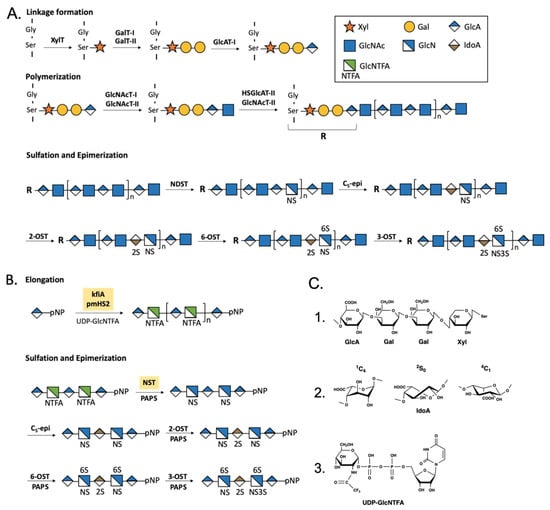 In contrast to DNA, RNA, and proteins, HS synthesis is not a template-driven process. HS isolated from cells or tissues are a complex mixture of polysaccharides with different sulfation patterns and chain lengths due to the lack of control of the biosynthesis of HS [19]. HS biosynthesis involves multiple biosynthetic HS enzymes. The process can be categorized into linkage formation, polymerization, epimerization and sulfation [20] (Figure 3). First, xylosyltransferases (XylT) initiate the linkage formation by transferring a xylose residue from UDP-xylose (uridinediphospho xylose) to their attachment sites on core proteins. Usually, the attachment site is a serine residue next to glycine surrounded by several acidic amino acids [21]. Two galactose residues and one glucuronic acid residue are added after xylose by galactosyltransferases (GalT-I and GalT-II) and glucuronosyltransferase (GlcAT-I), forming a tetrasaccharide as an initial linkage for HS (Figure 3C1). Second, an N-acetylglucosamine is attached to the tetrasaccharide at the non-reducing end by N-acetylglucosaminyltransferase I and II (GlcNAcT-I and GlcNAcT-II) to begin the polymerization of HS chains. The chain is elongated by HS glucuronytransferase II and N-acteylglucurotransferase II (HSGlcAT-II and GlcNAcT-II) by adding repeating disaccharide units of glucuronic acid (GlcA) and glucosamine (GlcNAc). GlcA can be altered to iduronic acid (IdoA) by glucuronyl C5-epimerase (C5-epi). The GlcA residue in HS is present in 4C1-chair conformation, whereas the conformation of IdoA is more flexible, displaying both 1C4-chair conformation and 2S0-skew boat conformation (Figure 3C2). Therefore, the conversion of a GlcA residue to an IdoA residue renders the conformational flexibility to HS [22]. Lastly, HS chains can be diversified by sulfation at the 2-position of GlcA/IdoA and/or N-, 3-, 6- position of glucosamine by N-deacetylase/N-sulfotransferase (NDST), 2-/3-/6-O-sulfotransferases (2-OST, 3-OST, 6-OST). It should be noted that epimerization and sulfation are ordered processes; N-sulfation is required before epimerization reaction, and 2-O-sulfation occurs before 6-O-sulfation [23]. The substrate specificities of epimerase, 2-OST and 6-OST have limited the structural randomness in the final HS products.