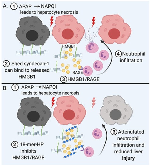 Mechanistic summary of sterile inflammation and 18-mer-HP’s role after acetaminophen (APAP) overdose. (A) 1. APAP overdose leads to accumulation of a toxic metabolite, N-acetyl-p-benzoquinone imine (NAPQI), which leads to hepatocyte necrosis and subsequent release of damage associated molecular patterns (DAMPS). 2. At the same time cell surface syndecan-1 is shed and can bind to extracellular HMGB1 through is HS chains. 3. HMGB1 that is not neutralized can bind to RAGE, resulting in neutrophil recruitment. 4. Neutrophils propagate initial injury by releasing reactive oxygen species and proteases which act on both damaged and healthy tissue. (B) 18-mer-HP reduces liver injury by inhibiting HMGB1-induced neutrophil recruitment.