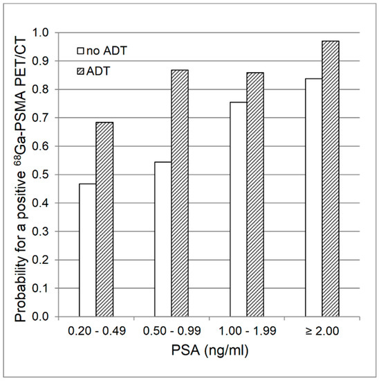 The precise detection and localization of tumor recurrence is crucial for subsequent management in patients with rising PSA-levels after initial, curative treatment with RP. This comparison of patients with and without ADT revealed an overall higher detection rate in patients with ADT, which was also present in each subgroup according to the respective PSA-level. This leads to a higher mean probability for a pathological finding in 68Ga-PSMA ligand PET/CT in patients receiving antiandrogen treatment (Figure 1). This is in line with prior studies on PSMA ligand PET/CT gathering evidence for a higher detection rate in patients with ADT [10,12,13,14]. However, this is the first study comparing groups, which were balanced for relevant factors, such as PSA-levels, Gleason score and prior radiation treatment.