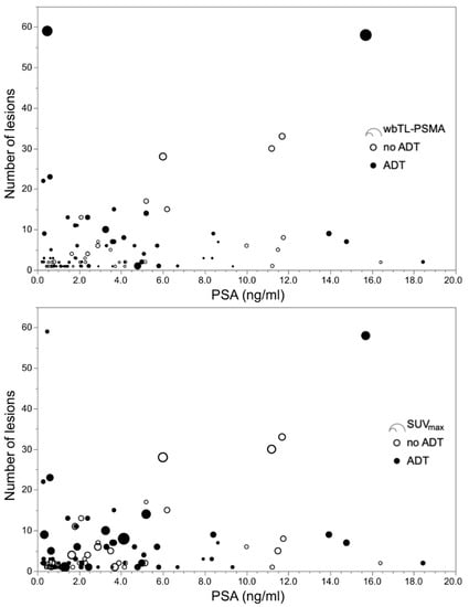 There are two potential explanations for the higher detection rate in patients with ADT: a higher PSMA-expression induced by ADT in tumor cells and thus, a higher visibility of tumor lesions, or higher tumor burden related to an advanced disease stage of patients with ADT. Whereas the duration of ADT was neither associated with a positive or negative PET finding nor with higher wbTL-PSMA and wbPSMA-TV in the ADT group, we observed higher wbTL-PSMA and wbPSMA-TV and, albeit not significantly, more patients had visceral and bone metastases within the ADT group than in the group without treatment. Furthermore, both groups showed remarkably wide and predominantly overlapping ranges of SUVmax. As depicted in Figure 2, high SUVmax values may occur in both groups in patients with high and low PSA-values, irrespective of the number of lesions. This suggests that the uptake is not primarily related to antihormonal treatment, but rather influenced by other factors such as the tumor cell proliferation of a specific lesion. During antihormonal treatment, PC typically develops androgen-resistance over time. Therefore, patients with CRPC have biologically different tumor lesions than HSPC patients within the ADT and the control group [24]. Subgroup evaluations showed a slightly higher detection rate and throughout higher quantitative imaging parameters in CRPC than HSPC patients and a continuum from CRPC over HSPC to PC without ADT (see Supplementary Table S1). However, a statistical comparison was not performed since PSA levels were unbalanced between groups, and biochemical and radiological surveillance (e.g., frequency of PSA level evaluation, baseline imaging) was not standardized in this retrospective cohort, potentially concealing a higher fraction of CRPC patients. This also precludes any conclusion on whether the castration state influences PSMA uptake, for which inconclusive findings have been presented so far [25,26]. Summarizing, a higher tumor burden (and/or more tumor lesions) and not a direct effect on PSMA-expression are likely the cause of better visibility and lead to a higher detection rate in patients with ADT.