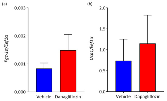Inhibition of SGLT2 promotes elevation of markers of BAT in WAT. (a) Pgc-1a mRNA expression and (b) Ucp1 mRNA expression; n = 7–8 mice/group. All data are presented as mean ± SEM.