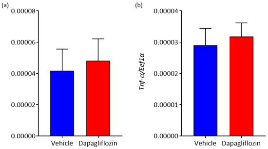 Finally, we sought to determine if SGLT2 inhibition could modulate expression of adipokines such as Il-6 and Tnf-α. Il-6 has been known to increase sympathetic activity [19] and Tnf-α is a well-known pro-inflammatory cytokine. SGLT2 inhibition was found to have no effect on either adipokine in our study (Figure 6).