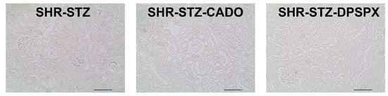 Negative control samples for non-specific binding of secondary antibody of kidney sections from SHR-STZ, SHR-STZ-CADO, and SHR-STZ-DPSPX were processed in parallel with the test sections using 10% serum (Vectastain Elite ABC kit; Vector Laboratories, Burlingame, CA, USA) instead of the primary antibody (Figure 1).