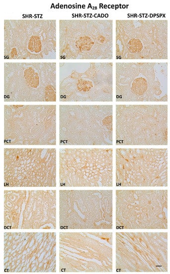 Representative photomicrographs of the immunoreactivity against the adenosine A2B receptors in the superficial (SG) and deep glomeruli (DG), proximal convoluted tubule (PCT), distal convoluted tubule (DCT), loop of Henle (LH), and collecting tubule (CT) from kidney sections of SHR-STZ (left panel), SHR-STZ + CADO (middle panel), and SHR-STZ+DPSPX (right panel) animals. Bars: 20 µm.