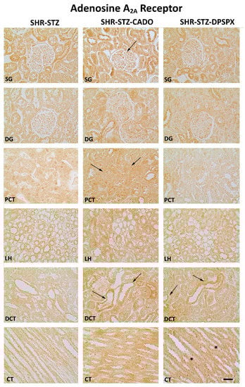 Representative photomicrographs of the immunoreactivity against the adenosine A2A receptors in the superficial (SG) and deep glomeruli (DG), proximal convoluted tubule (PCT), distal convoluted tubule (DCT), loop of Henle (LH), and collecting tubule (CT) from kidney sections of SHR-STZ (left panel), SHR-STZ + CADO (middle panel), and SHR-STZ + DPSPX (right panel) animals. Filled arrows: evidence more pronounced immunoreactivity than that exhibited by the SHR-STZ control group; *: evidence more pronounced immunoreactivity than that exhibited by the SHR-STZ+CADO group. Bars: 20 µm.