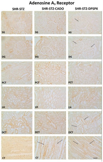 Concerning the immunoreactivity against the adenosine A3 receptor, it was much weaker than that observed for the other adenosine receptors (Figure 2, Figure 3, Figure 4 and Figure 5). In the SHR-STZ+CADO group, the immunoreactivity against the adenosine A3 receptor was lower than that observed in the control SHR-STZ group only in CT (Figure 5, open arrows, and Figure 7). Lower immunoreactivity against the adenosine A3 receptor was also observed in the SG, DG, DCT, and CT of SHR-STZ+DPSPX rats compared with control SHR-STZ rats (Figure 5, open arrows, and Figure 7). The immunoreactivity against the adenosine A3 receptor was markedly observed in the nuclei of glomerular and tubular cells (Figure 5), and the changes described in the treatment groups were also mostly observed for the immunoreactivity observed in the nuclei of cells (Figure 5).