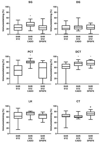 Quantitative analysis of the immunostaining (staining fractional area in percentage of the tissue total area; using the semiautomated computer-assisted image analysis “SACAIA” method) for the adenosine A2A receptors in the six renal structures from SHR-STZ, SHR-STZ + CADO, and SHR-STZ + DPSPX rats. Superficial (SG) and deep (DG) glomeruli, proximal (PCT) and distal (DCT) convoluted tubules, loop of Henle (LH), and collecting tubule (CT). Values are the median and 25th–75th percentiles (P25-P75) from four rats. * p < 0.05 vs. the corresponding SHR-STZ group; # p < 0.05 vs. the corresponding SHR-STZ + CADO group.