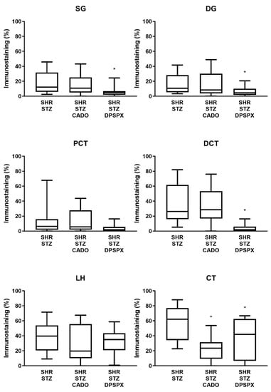 Quantitative analysis of the immunostaining (staining fractional area in percentage of the tissue total area; using the SACAIA method) for the adenosine A3 receptors in the six renal structures from SHR-STZ, SHR-STZ+CADO, and SHR-STZ+DPSPX rats. Superficial (SG) and deep (DG) glomeruli, proximal (PCT) and distal (DCT) convoluted tubules, loop of Henle (LH), and collecting tubule (CT). Values are the median and 25th–75th percentiles (P25-P75) from four rats. * p < 0.05 vs. the corresponding SHR-STZ group.