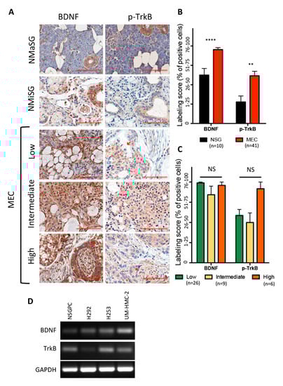 (A) Representative images of BDNF and pTrkB immunostaining in normal minor (MiSG) and major salivary glands (MaSG) and mucoepidermoid carcinoma (MEC) with different grades. Note the absence of pTrkB expression in mucous cells (arrow) and the presence of expression in cells associated with perineural invasion (asterisk). (B) The percentage of BDNF- and pTrkB-positive cells was significantly higher in MEC, compared to normal salivary gland tissue (scores obtained from the joint analysis of MaSG and MiSG) (p < 0.0001 and p = 0.0075, respectively, Mann-Whitney Test). (C) No significant difference was detected among the different MEC grades concerning BDNF and pTrkB expression (p > 0.05, Kruskal-Wallis Test), however, high-grade tumours presented a tendency for elevated percentage of pTrkB positive cells. (D) BDNF and pTrkB transcript levels in normal salivary gland primary cells (NSGPC) and MEC cell lines revealed higher BDNF expression in all MEC cell lines compared to NSGPC. Interestingly, high TrkB expression was observed in the high-grade salivary gland MEC (H253) with lower expression in the pulmonary MEC cell line (H292). The levels of UM-HMC-2 were similar to NSGPC (** p < 0.01; **** p < 0.0001, and NS p > 0.05).