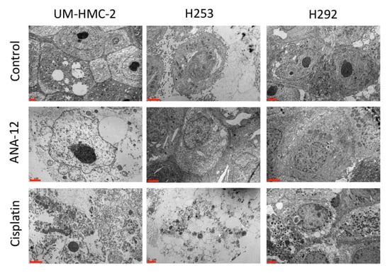 Representative images of MEC cells ultrastructural morphology following ANA-12 and cisplatin administration. Note, Cisplatin induced a high number of apoptotic changes such as decrease in cells size, “cup-shaped” chromatin condensation, convolution of the nuclear and cellular outlines, loss of cell contact, loss of specialized surface elements such as microvilli and cell–cell junctions, and ultimately cell fragmentation and formation of apoptotic bodies. Cytosolic constituents released into the extracellular space can be observed indicating a process of secondary necrosis. Scale bar—2 µm.