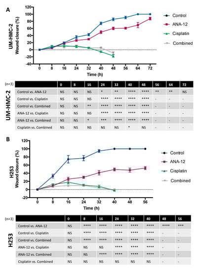 (A) UM-HMC-2 wound closure following ANA-12, Cisplatin and combined treatment. Note that the combined treatment presented the most promising results to delay wound closure in this cell line. (B) H253 wound closure following ANA-12, Cisplatin and combined treatment. Note that Cisplatin and the combined treatment results were similar and ANA-12 effects occurred earlier and in a greater magnitude, compared to UM-HMC-2 (* p < 0.05; ** p < 0.01; *** p < 0.001; **** p < 0.0001 and NS p > 0.05).