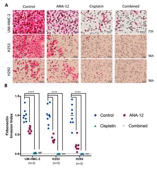 The impact of ANA-12 and Cisplatin on cell invasion was evaluated through transwell membranes coated with fibronectin, which is abundant in the connective tissue matrix, and mimics the ECM cells needed to invade during tumour progression []. Optimal time to invasion was determined for each cell line. UM-HMC-2 cells invaded faster in comparison to both H253 and H292 cells. This baseline difference in invasive capacity might be due to distinctive proteinases produced by the different cells; further experiments are needed to clarify this. Treatment with ANA-12 significantly delayed cell invasion in all cell lines evaluated (Figure 4A,B). Similarly, Cisplatin treatment significantly limited the invasive capacity of all cell lines (Figure 4A,B). Recently, it was demonstrated that Cisplatin caused the accumulation of stress fibres and actin disintegration, in malignant cells in vitro, resulting in increased cell stiffness hampering the cell motility []. In the present study, Cisplatin was more efficient in inhibiting cell invasion than therapy targeted against TrkB. The combination of ANA-12 and cisplatin, did not increase the inhibition of cell invasion over that seen with Cisplatin alone (Figure 4A,B).