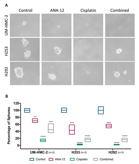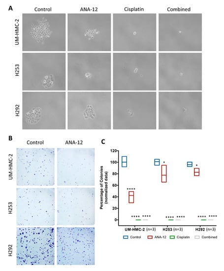 The cells were grown at 37 °C with 5% CO2 in a standard bench-top CO2 incubator, monitored daily using a phase contrast microscope, and cultured to a maximum of 70% confluence before passage, to avoid stress. All experiments were carried out with a maximum of 10 passages. Cells were treated with Cisplatin (Sigma-Aldrich) and ANA-12 (Sigma-Aldrich). The IC50 of the drugs being previously established for each cell line, using a crystal violet viability assay in monolayer adhered cells []. For UM-HMC-2, H253 and H292 cells, the IC50 doses for Cisplatin were 15.4 µM, 13.2 µM and 14.5 µM, respectively and for ANA-12, these were 13.6 µM, 14.7 µM and 10.8 µM, respectively. All cell lines were routinely tested to confirm the absence of mycoplasma contamination.