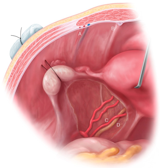Illustration showing left suspended ovary to the anterior abdominal wall after endometriosis surgery with important anatomical structures. (A) Inferior epigastric vessels in the lateral umbilical fold. (B) Medial umbilical ligament. (C) Uterine Artery. (D) Ureter.