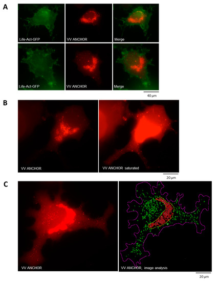 As described in Figure 1B, the VACV ANCHOR produces a more punctate signal than the mCherry encoded by VVTG18306. To investigate the nature of this punctate signal, we used high resolution imaging of VACV ANCHOR infected HeLa cells transfected with a fluorescent actin staining protein (pLife-Act GFP; Figure 2A) to observe cytoskeleton architecture and dynamics upon infection (Video S2). The punctate fluorescence observed at a low magnification represents a strong accumulation of VACV ANCHOR DNA particles in a crescent shape structure in the center of the cell. This crescent shape structure is often linked to the accumulation of donut-like circular structures that contain several spots of VACV ANCHOR DNA. Additionally, the number and intensity of these fluorescent spots increase over time post-infection (Video S2). The crescent shape structure likely represents the VACV ANCHOR replication center (RC) in living cells. Due to the intensity of the RC signal, small cytoplasmic particles of lower fluorescence intensity are difficult to detect. To see if only the RC can be detected or if single particles in the cytoplasm can be imaged, we oversaturated microscopy pictures, triggering the complete saturation of the RC signal (Figure 2B, left raw data, right saturated). Using this artificial saturation, we can clearly visualize a large number of particles in the cytoplasm of the cell, indicating that particles that are produced in the RC can then be distributed in the cytosol. To investigate the dynamics of these particles, we performed live cell imaging of a cell at 120 ms interval. Saturating the RC signal gives us a clear view of the dynamics of the fluorescent particles (Video S3). To illustrate the dynamics of the VACV ANCHOR in living cells, the time interval was compressed on a single frame using Z-stack Max projection and overlaid with the frame at T0. The resulting images display the initial particle position in yellow and its trajectory in green (Figure S2). As illustrated, large VACV ANCHOR DNA clusters do not display rapid dynamics during the imaging duration (20 frames, 2.5 s, streaming mode). However, the smallest particles display different dynamics. Some particles clearly display diffusive and even oriented movements. However, the vast majority of small particles are almost immobile, indicating that these particles may be bound to subcellular structures. Peak intensity measurements of the smallest particles give a relative intensity value of 49.3 in average (±3.4) whereas particles that display a stronger fluorescence intensity display a value of 98.2 (±17), suggesting that more intense particles contain two copies of the VACV DNA. Altogether this result shows that VACV ANCHOR DNA particle displays a broad range of behavior, from immobile large clusters to highly dynamics particles in the cell. To better quantify the signal provided by the VACV ANCHOR, we used image analysis to determine VACV ANCHOR copies per cell (Figure 2C, left: unprocessed, right: image analysis). The outline of the cell was first estimated using simple thresholding, and then further segmented into RC and cytosolic compartments based on a multivariate Gaussian process assumption. Inside each compartment, corresponding image regions were preprocessed using non-local means denoising, and single VACV clusters were segmented using a hybrid watershed algorithm combining gradient cues and a priori information on particle morphology. The total number of VACV clusters reached 593 in this HeLa cell, comprising 394 clusters in the RC and 199 in the cytoplasm. By making the assumption that the single low intensity diffusive particles that we can observe in the cytoplasm correspond to unique VACV DNA particles, a VACV DNA copy number can be determined, reaching 1682 copies in this cell (1090 in the RC and 592 in the cytoplasm, 2.8 copies/cluster in average in the RC and 2.9 copies/cluster in the cytoplasm). However, we do not know if the number of copies corresponds to fully mature VACV particles or replicating or aborted DNA. Indeed, the presence of the ANCH sequence alone triggers the apparition of fluorescent spots and some of them may reflect uncompleted viral DNA.