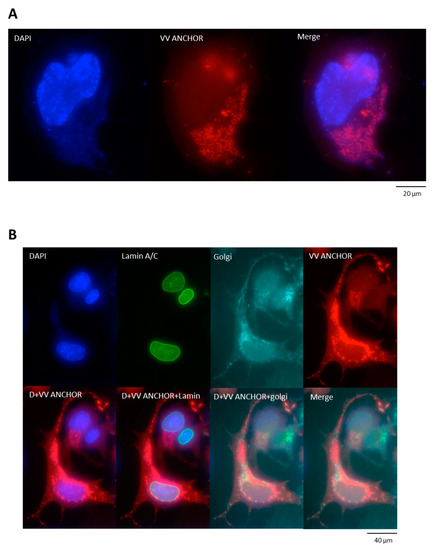 As described in Figure 1 and Figure 2, VACV ANCHOR provides a strong signal that can be used to quantify VACV dynamics and replication. However, we do not know if the signal will be conserved in fixed cells and after processing for other classical staining such as immunofluorescence. To perform this experiment, we infected HeLa cells at a MOI of 0.25 and fixed them 24 h post-infection using formalin (Figure 3A). Cells were then stained with Hoechst 33342. As illustrated, the VACV ANCHOR signal is conserved after fixation. Additionally, the structure of the RC is conserved and appears to be Hoechst positive, confirming the presence of a large amount of DNA in this structure. To go further, we performed immunofluorescence against different cellular structures to verify that VACV ANCHOR signal is maintained and can be correlated to the accumulation of a marker of interest. We used lamin A/C, tubulin and vimentin antibodies, all proteins being involved in cellular architecture (Figure 3B–D and Videos S4–S6, respectively) coupled with the staining of the Golgi apparatus. As shown in Figure 3B, the VACV ANCHOR signal is conserved even after the immunofluorescence protocol, indicating that the signals survive cell permeabilization. Additionally, no defect in the lamin A/C staining was observed, as VACV replication occurs strictly in the cytoplasm. Detection of the microtubule network was also achieved (Figure 3C) and vimentin reorganization upon VACV infection was also detected as structuring the RC (Figure 3D) as described previously [21]. Combined with Z-Stack acquisition and 3D rendering using Imaris software, it allows 3D reconstruction of the cellular volume and the precise determination of VACV position in 3D according to a marker of interest (Videos S4–S6). These results show that VACV ANCHOR provides a strong signal that can be combined with other classical staining methods such as immunofluorescence to correlate VACV infection, localization and replication with cytoskeletal network markers or other cellular or viral elements of interest.