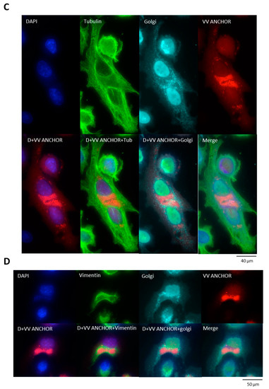 - Risco, C.; Rodriguez, J.R.; Lopez-Iglesias, C.; Carrascosa, J.L.; Esteban, M.; Rodriguez, D. Endoplasmic reticulum-Golgi intermediate compartment membranes and vimentin filaments participate in vaccinia virus assembly. J. Virol. 2002, 76, 1839–1855. [Google Scholar] [CrossRef] [PubMed]