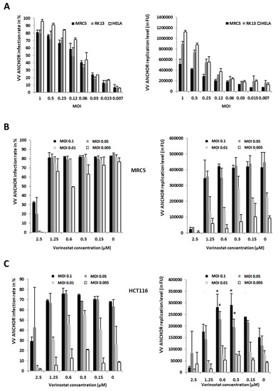 Use of VACV ANCHOR to measure infection capacities and the impact of oncolytic activators. (A) Cell lines were plated in 96 well plates and infected with VACV ANCHOR at the indicated MOI. Twenty-four hours post-infection, cells were fixed and stained with Hoechst 33342. Quantification of the infection rate and the VACV ANCHOR replication level was performed on a Cellomics Arrayscan high content microscope. Results are the average of 3 independent wells + SD. (B) MRC-5 cells were treated with increasing concentrations of vorinostat and immediately infected with VACV ANCHOR at the corresponding MOI. Cells were fixed and processed for high-content imaging (HCI) as in A, 48 h post-infection. Results are the average of 3 independent wells ± SD. (C) HCT 116 cells were treated with increasing concentrations of vorinostat and immediately infected with the corresponding MOI. Cells were fixed and processed for HCI as in A, 48 h post-infection. Results are the average of 3 independent wells ± SD. * p < 0.05 compared to cells infected at the same MOI without vorinostat treatment.