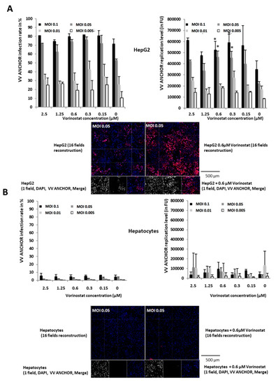 As described in Figure 4, VACV ANCHOR can be used to rapidly measure the fitness of infected cell lines. To illustrate its oncolytic potential, we measured infection and replication capacities on human primary hepatocytes versus the Hep G2 liver cancer cell line (Figure 5A,B). In Hep G2 cells, VACV ANCHOR reached 80% infection at the highest MOI 48 h post-infection, and achieved moderate replication rates, reaching 300,000 FU in untreated conditions. As previously described using HCT 116 cells (Figure 4C), vorinostat treatment triggers almost a two-fold increase in VACV DNA replication rate, the best effect being achieved once again at 0.6 and 0.3 µM (Figure 5A, see graph and microscopy pictures at the bottom). Contrary to Hep G2 cells, primary hepatocytes do not divide in culture. According to recommendations of the supplier, cells were plated at 5 × 104 cells per well, contrary to Hep G2 cells that were plated at 1 × 104 cells per well. Therefore, to achieve the described MOI in primary hepatocytes, VACV ANCHOR particle quantity was multiplied by five. Even with this high titer of virus, primary hepatocytes were barely infected, reaching only a low percentage at the highest concentration. In primary cells, as previously described [13], replication of the double deleted VACV is almost completely abolished and is not reactivated by Vorinostat treatment (Figure 5B, see graph and microscopy pictures at the bottom). In absence of viral replication, the presence of small cell debris (false positives) can trigger a jump in the quantification, explaining large error bars. These results show that VACV ANCHOR can efficiently infect and replicate in cancerous liver cells but does not infect and destroy its primary normal cells, indicating that this virus has acquired cancer specific tropism.