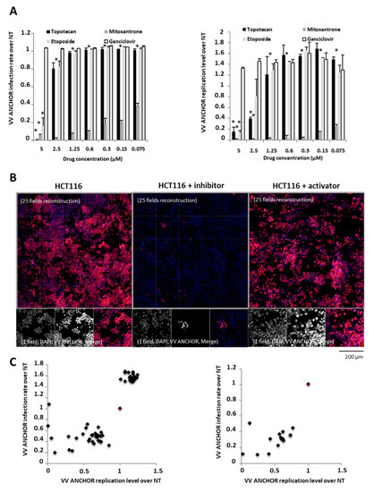 VACV ANCHOR responds to the anticancer treatment and allows fast and efficient discovery of new oncolytic modulators. (A) HeLa cells were treated with the indicated concentration of compounds and immediately infected with VACV ANCHOR at an MOI of 0.25. Cells were fixed and processed for HCI 48 h post-infection. Results are expressed as fold increased between treated and non-treated cells (NT). Values are average of 3 independent wells ± SD. * p < 0.05 compared to infected cells without drug treatment. (B) HCT 116 cell line was used in a high-content screening campaign to identify potential inhibitor or activator of VACV ANCHOR oncolytic capacities. Cells were plated at 1 × 105 cells/well. The day after, cells were treated with 1.25 µM of test compounds and immediately infected with the virus at a MOI of 0.05. Seventy-two hours post-infection, cells were processed for HCI. Example of signal untreated (left), treated with an inhibitor (middle) or with an activator (right) are displayed, either a 25-field reconstruction of the well or a single field at the bottom. (C) Scatter plot of the hits identified at the primary (left) and the secondary (right) screening. Value for each compound passing the threshold is displayed (black dot). The control value without drug treatment is indicated by a red dot.