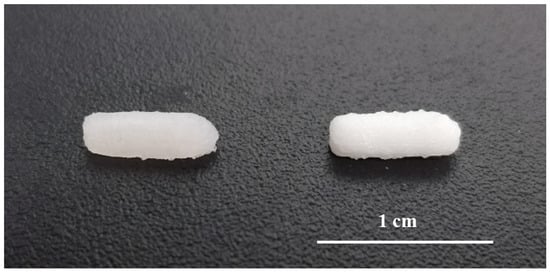 Picture of 3D printed suppositories without barium sulphate (left) and with barium sulphate (right).