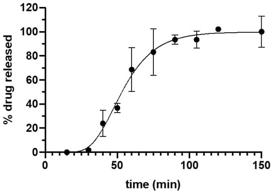 Tacrolimus dissolution data is shown in Figure 3. The fitting of the experimental data to Equation (1) yielded a high correlation coefficient (R2) = 0.9927. The maximum percentage of drug released was 99.80 ± 2.43 and the minimum 4.41 × 10−8 ± 3.29 × 10−7, with a k value of 0.065 ± 0.007. The drug release from the suppositories showed a lag time of 15.5 min that could be explained by the time required for the disaggregation of the suppository and the beginning of emulsion formation. Afterwards, there was a continuous release of the drug with more than 50% of tacrolimus released within the first hour, achieving 100% release of the drug at 90 min. The complete release of the drug from the formulation corresponds to the asymptotic part of the curve.