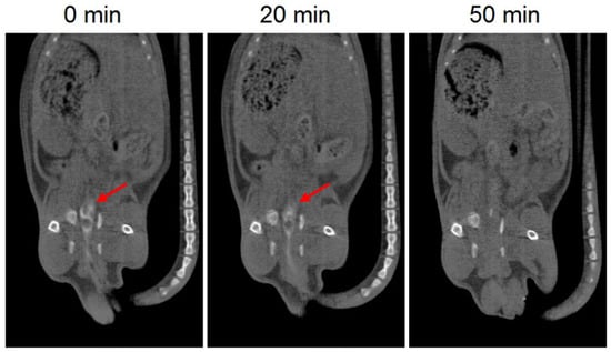 CT images of 3D printed suppositories with barium sulphate at different times. The red arrow indicates the location of the suppository (white color).