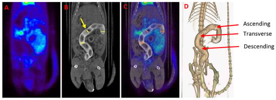 (A) Gastrointestinal PET image of a healthy animal. (B) CT scan of the same animal. A contrast agent was used for enhancing contrast in the colon of the animal (white color). The yellow arrow indicates one of the circularly delineated regions of interest (ROIs). (C) [18F]FDG PET/CT image obtained by the fusion of (A) and (B) images. Notice the normal [18F]FDG uptake in the heart, bladder and kidneys. (D) Three-dimensional colon reconstruction from CT images with the three colonic sections indicated by the red arrow (ascending, transverse and descending).