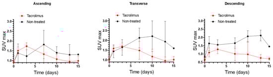 Longitudinal SUVmax values for ascending, transverse and descending colonic segments over time for non-treated rats and animals treated with the 3D printed tacrolimus suppositories. Error bars represent standard deviation (SD).