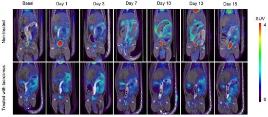 Statistical analysis was carried out using a two-way analysis of the variance (ANOVA) including as factors time after induction of TNBS colitis and treatment. The data for non-treated animals were obtained from the previous work of this group [13] to compare the previous results with those obtained in the present study for animals treated with tacrolimus. Furthermore, Sidak’s multiple comparisons test was carried out for comparing SUVmax values over time. (GraphPad Prism (version 7.0, CA, USA), p < 0.05 was considered statistically significant).