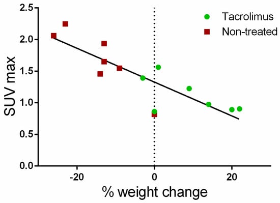 Furthermore, a correlation (Pearson coefficient R2 = 71.48%) was found between the average SUVmax values for the ascending, transverse and descending regions of the colon with weight changes for each day on which PET/CT studies were performed. As can be seen in Figure 8, weight changes with respect to baseline are clearly associated with SUVmax values. Positive weight changes are linked to lower SUVmax values, which are mainly found in the group treated with tacrolimus suppositories. On the contrary, weight loss is related to the higher SUVmax values found in the non-treated group.