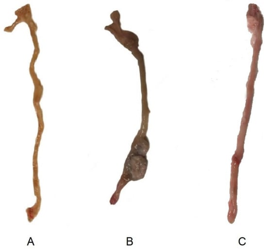Macroscopic images of ex-vivo colons on day 15 post-TNBS induction in (A) control group (healthy animals) (13), (B) non-treated inflammatory bowel disease (IBD) rats, and (13) (C) IBD rats treated with tacrolimus.