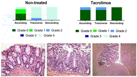 Above, graphical representation of Nancy grades for ascending, transverse and descending colon sections for non-treated and tacrolimus groups. Below, representative optical microscopy images at 40× (left and middle) and 10× magnification (right) of the Nancy index obtained from rats treated with tacrolimus suppositories. On the left, histologically normal mucosa corresponding to grade 0 of the Nancy index. On the middle, note the presence of occasional neutrophils in the lamina propria, with no signs of ulceration, corresponding to a grade 2 of Nancy index. On the right, ulcerated colonic mucosa, with loss of crypts replaced by granulation tissue, corresponding to a grade 4 of the Nancy index [13].
