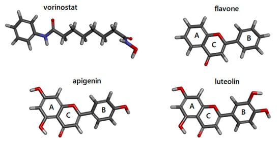 Docking simulations were performed between the two enzymes and vorinostat, flavone, apigenin, and luteolin, with AutoDock 4.2 and AutoDockTools4 [16], to verify the suitability of the molecular structure of flavone, apigenin, and luteolin to interact with HDAC1 and HDAC2 at the same binding site occupied by vorinostat.