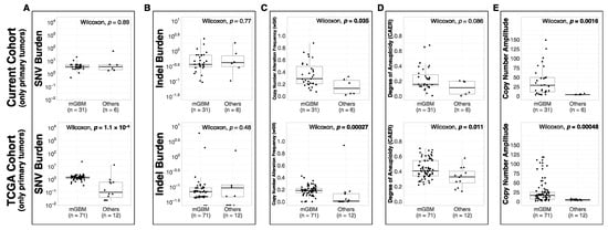 We compared the metrics between the molecular subsets in primary tumors. In the current cohort, the median SNV burden values of mGBM (3.38/Mb) and “Others” (3.59/Mb) were similar (p = 0.89, Figure 1A). In the TCGA cohort, mGBM (1.34/Mb) had higher SNV burden compared to “Others” (0.1/Mb, p < 0.001). There was no significant difference in indel burden of different molecular subsets in neither the current nor the TCGA cohort (p = 0.77 and p = 0.48 respectively, Figure 1B). In the current cohort, mGBM had higher median wGII (0.29) compared to “Others” (0.13, p = 0.035, Figure 1C). The same was observed in the TCGA cohort: mGBM had higher median wGII (0.19) than “Others” (0.01, p < 0.001). In the current cohort, there was no significant difference in median CAER between the subsets (p = 0.086, Figure 1D). In the TCGA cohort, mGBM had higher median CAER (0.41) compared to “Others” (0.33, p = 0.011). In the current cohort, mGBM had higher median CN amplitude (29) compared to “Others” (4, p = 0.0016, Figure 1E). In the TCGA cohort, again, mGBM had higher median CN amplitude (17) compared to “Others” (5, p < 0.001).