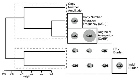 Metrics associated with mutational processes and copy-number-associated processes for 2 distinct clusters. Correlogram of both quantitative and qualitative metric, sizes indicate the |correlation coefficient|. The hierarchical clustering dendrogram is displayed on the left, the identified clusters are indicated by dashed rectangles.