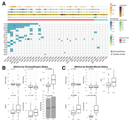 Chromothripsis and double minute events are associated with copy-number alteration. (A) A waterfall plot displaying the overview of chromothripsis and double minute events in primary tumors. (B) Comparison of metrics according to chromothripsis status. Cases with chromothripsis had significantly higher frequency of copy-number alterations (wGII). (C) Comparison of metrics according to double minute status. Cases with double minutes had significantly higher copy-number amplitudes and chromosomal arm event ratios. Bold p values indicate statistical significance (p < 0.05).