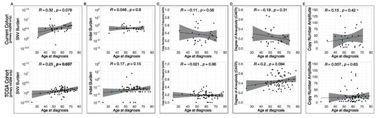 Next, correlation of each metric with age at diagnosis was investigated. To remove any confounding effects of molecular class and recurrence, only primary mGBMs were analyzed for both the current and TCGA cohorts (Figure 5). This analysis yielded that SNV burden was positively correlated with age at diagnosis (R = 0.32, p = 0.079 for the current cohort, R = 0.25, p = 0.037 for the TCGA cohort, Figure 5A). Indel burden, wGII, CAER and CN amplitude displayed no significant correlation with age at diagnosis (Figure 5B–E). In both the current and TCGA cohorts, there was no significant difference in age at diagnosis between cases with CT and without (p = 0.48 and p = 0.5 for the current and TCGA cohorts, respectively). There was no difference in age at diagnosis between cases with DMs and without (p = 0.75).