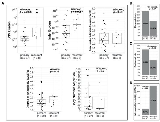 To evaluate how metrics differ in primary vs. recurrent tumors, first, we compared primary tumors (n = 37) and recurrent tumors (n = 8). SNV and indel burden were significantly higher in recurrent tumors (p = 0.0066 and p = 0.0057, respectively), whereas wGII, CAER and CN amplitude displayed no significant difference (Figure 6A). There was no significant difference between the proportions of primary and recurrent tumors with and without CT (χ2 p = 0.67, Figure 6B), 43.24% of primary tumors had DMs compared to 25% of recurrent tumors (χ 2 p = 0.58, Figure 6C) and 2 primary tumors (5.71%) and 2 recurrent tumors (25%) were predicted to have MSI (χ 2 p = 0.28, Figure 5D).
