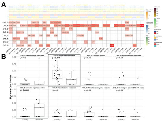 Contributions of clock-like and mismatch repair deficiency-associated signatures differ between primary and recurrent tumors. (A) A heatmap of central nervous system (CNS)-associated mutational signatures in primary tumors (mismatch-repair-associated signature CNS-E and homologous-recombination-associated signature CNS-H are marked in bold). Clock-like signature CNS-B was the most common signature. (B) Comparison of signature contributions between primary and recurrent tumors. Mismatch-repair-associated signature CNS-E was significantly higher in recurrent tumors. Bold p values indicate statistical significance (p < 0.05).