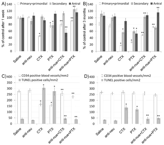 Ovarian follicles in mice after chemotherapy treatment with or without anti-HER2/neu (α-neu). Ovaries were processed as described in the legend of Figure 2 and the average number of primordial and primary (white bars), secondary (grey bars) and antral (black bars) follicles per transverse sections of ovary 1 week (A) or three months (B) after treatment was measured. Bars are mean ± SEM. (*)—significantly different from control value (p < 0.05). (**)—significantly different from chemo only group (CTX or PTX without anti-neu; p < 0.05). The average number of CD34 positive blood vessels/mm2 (white bars) and TUNEL positive cells/mm2 (grey bars) ovary 1 week (C) or three months (D) after treatment was counted. Bars are mean ± SEM. (*)—significantly different from control value (p < 0.05). (**)—significantly different from chemo only group (CTX or PTX without anti-neu; p < 0.05).