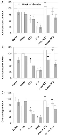 Ovarian reserve in mice after chemotherapy treatment with or without anti-HER2/neu. Mature female mice were treated as described in the legend of Figure 1. Ovaries were excised from mice one week (1 W) or three months (3 M) after treatment and ovarian spermatogenesis- and oogenesis-specific basic helix-loop-helix transcription factor 2 (SOHLH2), newborn ovary homeobox gene (NOBOX) and FIGLA mRNA ((A–C), respectively) were measured. Bars are % of control ± SEM. (*)—significantly different from control value (p < 0.05). (**)—significantly different from chemo only group (CTX or PTX without anti-neu; p < 0.05).
